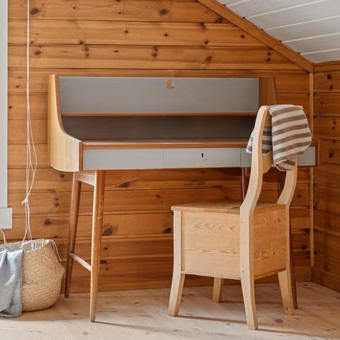 Skrivebordet er i god stand. Det er nok på tide med en ny runde med olje for å gjøre treverket finere. Nøkkel til midterste skuff medfølger ikke.