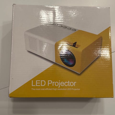 Bærbar projektor av merke "mm", fungerer som den skal. Er med tilhørende strømkabel og fjernkontroll.
