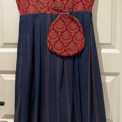 Lite brukt og veldig pen festdrakt.Stakk i tynn og behagelig ulldamask. Dekor bånd i brokade og fløyel. Livet er brokade. Skjorte i bomull. Veske med lås, ikke sølv.