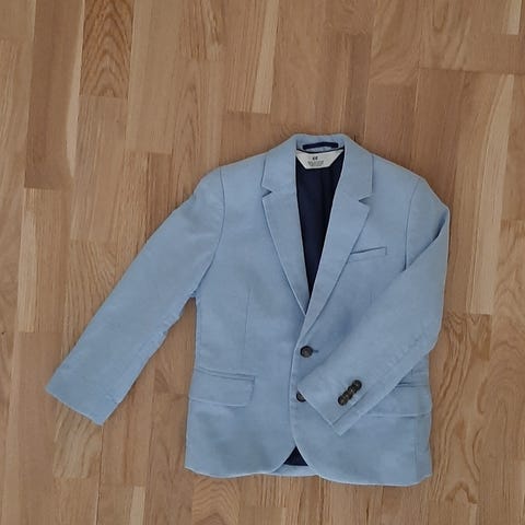 Fin blazer til gutt fra HM i str. 116. Lyseblå dressjakke. Pent brukt. Superfin på sommeren.