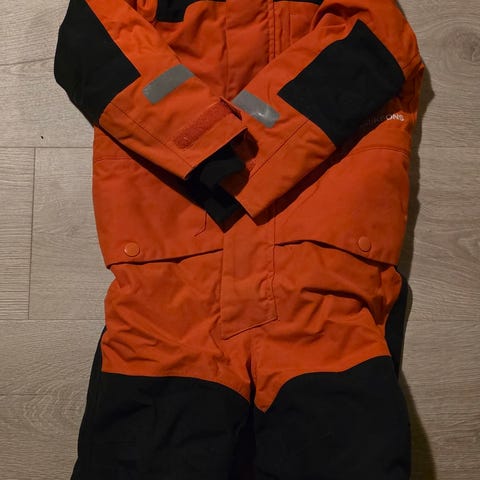 Didrikson vinterdress str 90. Brukt av ett barn en sesong. Selges rimelig da skinnet på hetten har blitt borte. Litt synlig slitasje der stoffet har gnisset mot hverandre på lårene. Se bilder for nærmere beskrivelse.