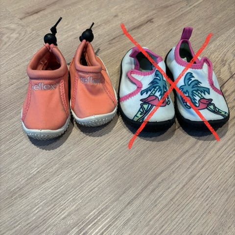 Slipstop sokkene til venstre er i str 28, vannsandaler i midten er str 29 og reflex vannsko til høyre er i str 30.
