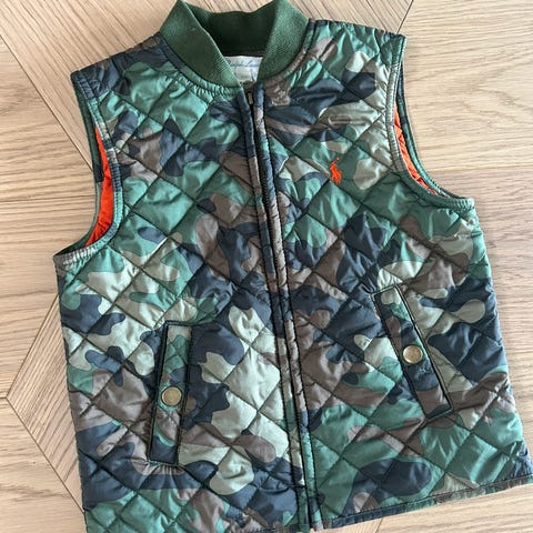 En vattert vest i quiltet, vevd kvalitet med ribbestrikket, høy krage, glidelås foran med hakebeskyttelse og lommer foran med klaff og borrelås.