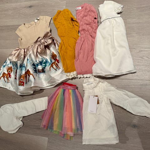 Klespakke til jente i str 98/104 selges da det ikke blir brukt. Normal bruksslitasje. Noe ekstra slitasje på printet på ene t-skjorten, men de fleste plaggene fremstår i svært god stand. 😊