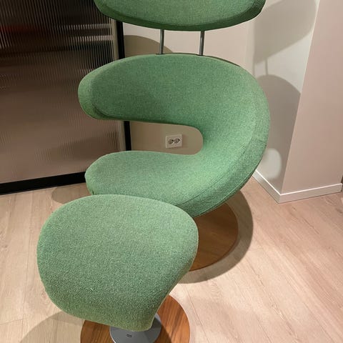 Eksepsjonelt behagelig og funksjonell lenestol og fotskammel i ull (som ny).