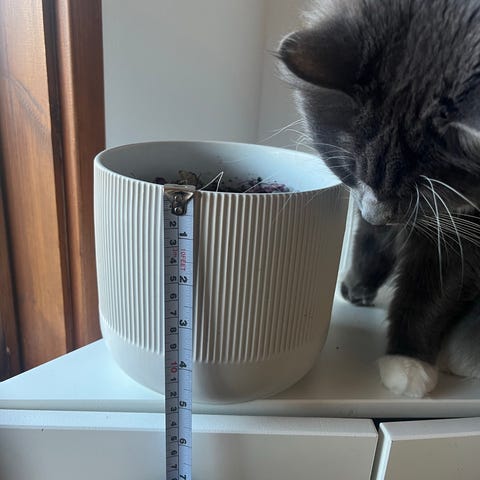Grå plast/kompositt materiale. Utvendig mål: 34 cm diameter, 32 cm høyde
