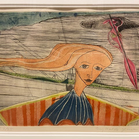 Litografiet «Femme Avec Fleurs Au Cheveux» (Kvinne med blomster i håret) av den franske kunstneren Pierre Bertin (1926–2006). Arkformat: Høyde 56 cm, bredde 75,5 cm. Motivmål: Høyde 40 cm, bredde 60 cm. Nummerert og signert.