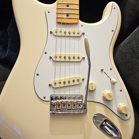 Har per nå tatt av dekselet til fjærene bak, men dette og tilhørende skruer vil følge med på kjøpet, hvis man vil skru det på igjen :) Følger også med original tweed-case, original vintage-strap, og et vintage ashtray-deksel, for de som ønsker en sann vintage look. Har også en litt «bøyd» vibbarm, slik at den ikke stikker så mye ut fra gitaren.