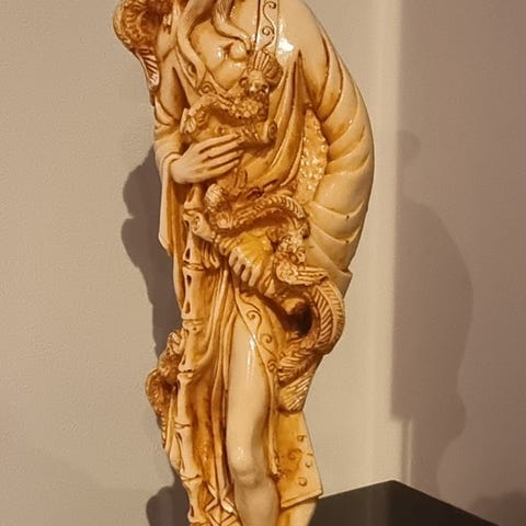Orientalsk kunst. Detaljert og dekorativ vintage figur av en eldre asiatisk mann med tradisjonell drakt, hatt og en drage som slynger seg rundt kroppen. Stilen minner om figur av daimyo eller mandarin-keiser, som ofte fremstilles i dekorative sett. Figuren har et elfenbensfarget preg med antikk patina og står støtt på en rund sokkel. Perfekt for samlere av orientalsk kunst og vintageobjekter, eller som dekorasjon i hjem med klassisk eller eksotisk stil.