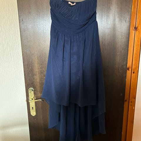 Lekker blå kjole med bar rygg, str M, bare 4 kopier, er designer kjole, veldig lang, brukt en gang, ingen skader,
