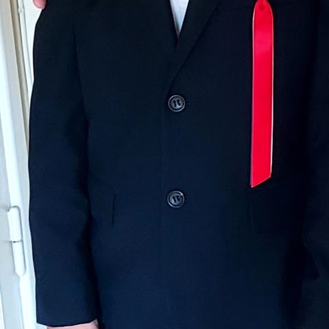 Fin dress fra Cubus. Bukse i str 10 år og jakke i 11 år. Min sønn var ca 11 år da han brukte dette settet sammen. Han var normal i størrelsen i forhold til alder.