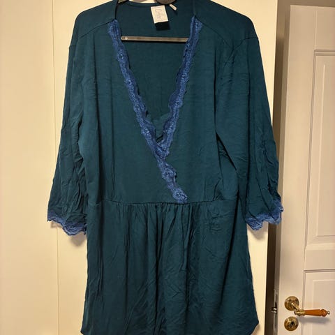 Nydelig turkis farge med vakre dekorasjon langs V-halse fra Barfota. Ikke gjennomsiktig ~ 100% viskose