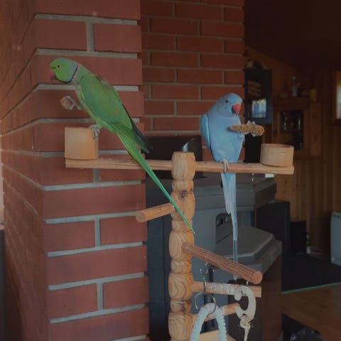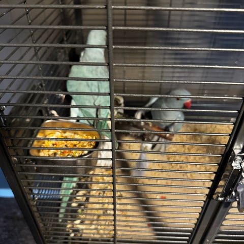 Dem ønsker flytte til en bedre flyplass. Dem bor nå sammen med undulater i liten volier men ser dem trenger mer.