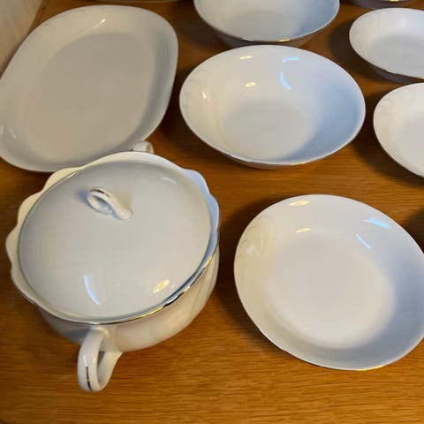 Gammelt men like pent middags service. Potet skål med lokk, to saus øser, et stort og et litt mindre ovalt serveringsfat. Stort rundt serverings fat. To store serverings skåler. Og ti middags tallerken. Ønsker 2000, men kom gjerne med et fornuftig bud.