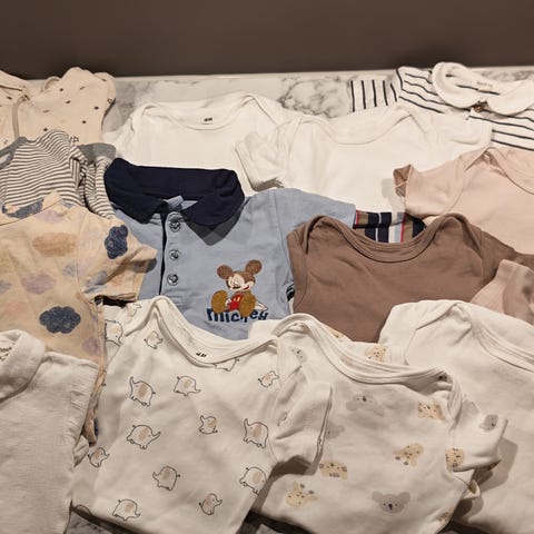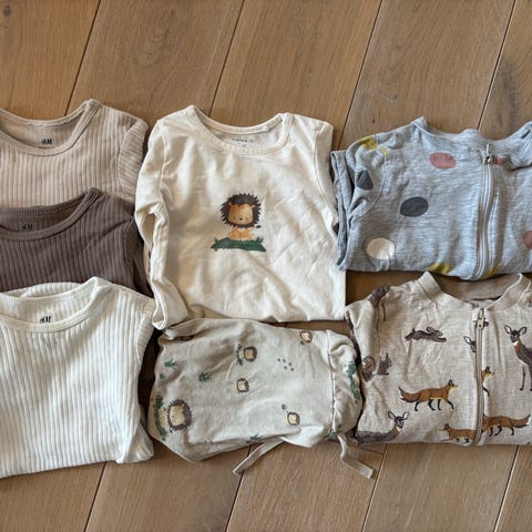 Stor pakke i str 98/104. 11 bodyer, 2 gensere, 2 bukser, pyjamas. Alt nytt.