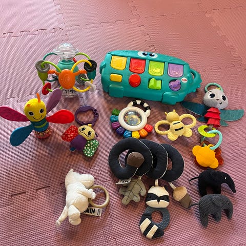 2 for 100kr. 11stk Babyleker henges på barnevogn, noen med musikk / lyd / speil.