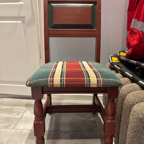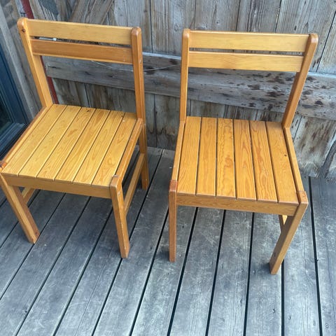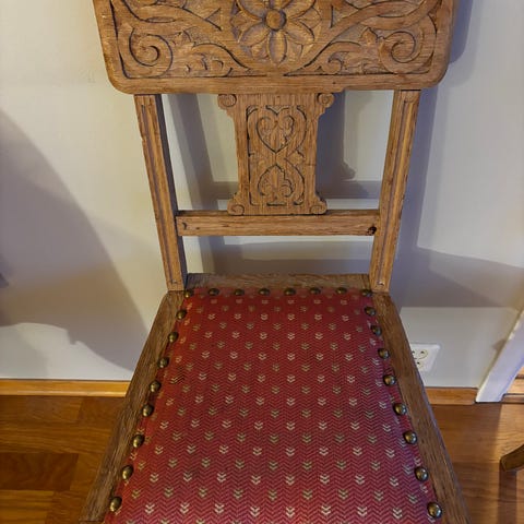 Østerdalsstoler antikkmalt rød og blå. 8 stk selges for kr 300 pr stk. Pene og i meget god stand.