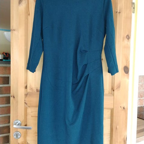 Stretchy kjole, strykefri. Kledelig overlagt splitt fremme. 96 cm lang. Fin konvoluttveske på kjøpet, ikke med skulderrem.