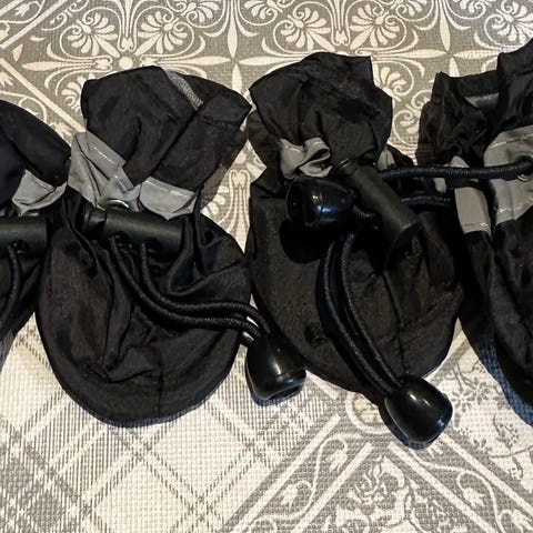Passer til chihuahua og lignende små hunder. 2 komplett skoene i gull og rød farge. Dem ble bare prøvd en gang. Kan sendes
