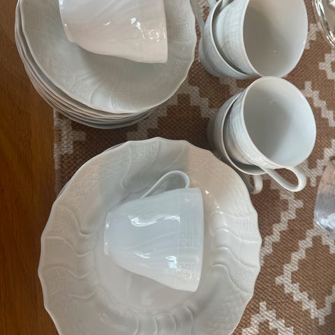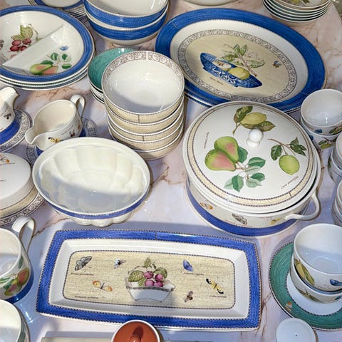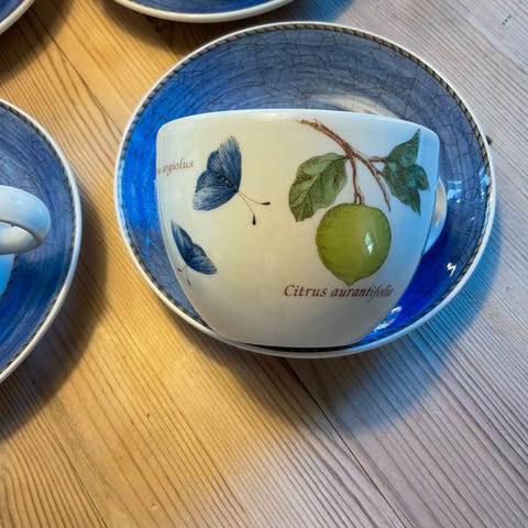 En skål (sweet meat) 15x15 cm og en asjett D: 21 cm til serviset Sarahs Garden fra Wedgwood. Begge i fin stand med grønn kant, friske farger i motivet og blank glasur. Firkantet skål kr. 900,- asjetten er solgt.