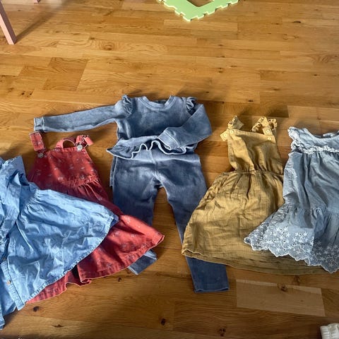 Fire nydelige kjoler selges samlet. Den hvite er bittelitt missfarget ved halsen. Den rosa er ganske kort, så mer som en topp.