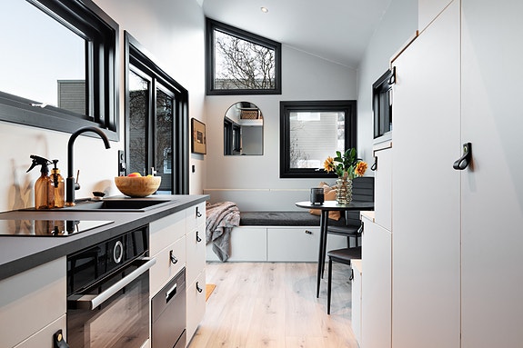 Denne modellen har en romslig stue/kjøkken løsning med store vindusflater i enden av vogna.