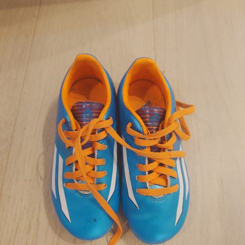 Fotballsko fra Adidas med knotter, størrelse 33. Blå med grønne lisser og detaljer. Strikk rundt ankelen så de sitter godt.