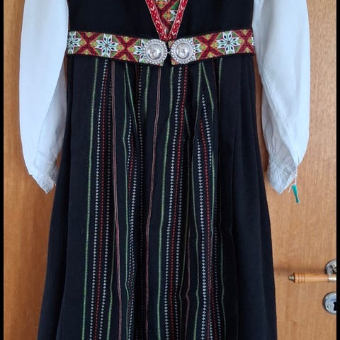 Plissert stakk med vevde bånd og det samme på vesten. Passer til en høyde pr nå 167, om nedlegging 5 cm passer den til en på vel 1.70.