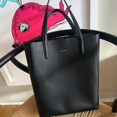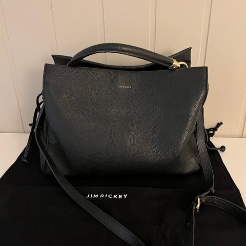 Nydelig veske fra Jim Rickey i svart med gulldetaljer selges. Praktisk størrelse, med både lite hank samt lengre cross-body stropp som er avtagbar. Noen små bruksmerker kan forekomme, men kan ikke se noen skader i skinnet.