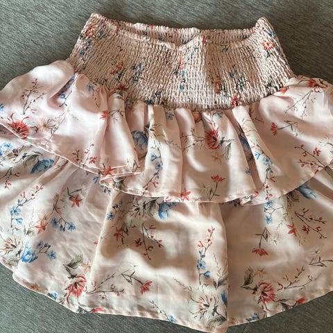 Superfint kremhvitt fóret langt (sommer-) skjørt m strikk i midjen. hullmønster og duske-pynt i sidene. Laget i India for Zara kids. Str. 164 cm, men ikke veldig stort, så mer en vanlig 158/164 (XS) størrelse. Kun brukt noen få ganger og fremstår som nytt.