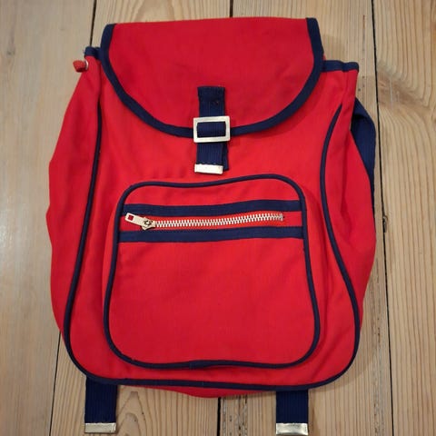 Fra 1970 tallet. Sekk til barnehage eller til annet bruk, i oransje. Slitasje på reimer og flekker på bakside (se bilde). Men mye bruk igjen😀 Porto kommer i tillegg.