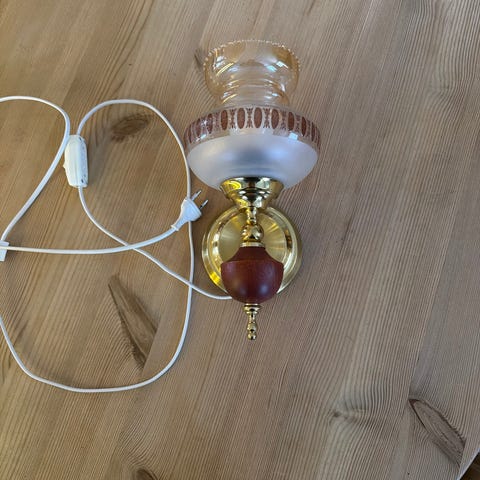 Sjelden flott "Sol" vegglampe i bambus og en flott tonet glasskuppel. Den er i fin stand, men den ene tynne "bamusstrålen" er knekt på midten(se bilde). Ledningen har bryter.