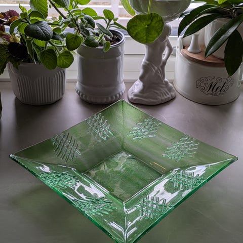Unik håndlaget Murano-krystallskål fra Archimede Seguso med “bullicante”-teknikk. Skålen har en vakker grønn farge og er et eksemplarisk eksempel på mesterlig håndverk fra Murano.