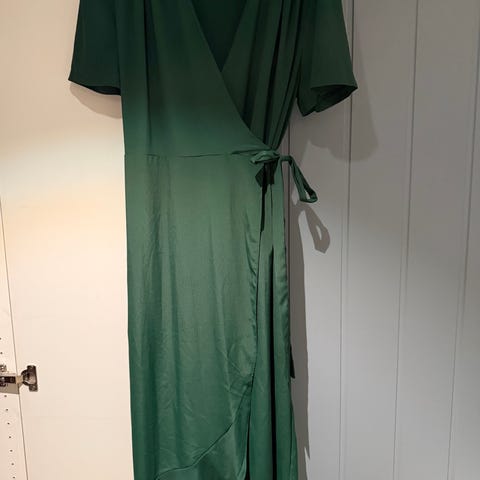 Gøyal knallgrønn kjole med T-shirt topp og asymmetrisk underdel med masse vidde og frontlommer. Onesize, men passer nok en L/LX. Bildet tatt ute viser fargen best. Bredde t-skjorteoverdel 52cm, lengde 93cm, målt bak. Kjøpt og laget i Italia. 95% bomull/5% elastan. #grønn #vidde