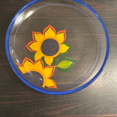 Koselig fat i gjennomsiktig glass med blå blomst.