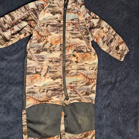 veldig god softshelldress fra name it med kult dinosaurmønster. Kun brukt noen få ganger. Har likevel fått to helt små hull på kneet (se bilde). Hullene er kun i det ytterste beskyttelsesstoffet, og påvirker dermed ikke bruk. Fortsatt vann- og vindtett.