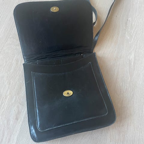 Praktisk og fin liten sort skinn sekk/veske. Ekstra lomme utenpå og rom på baksiden til lommebok og telefon osv.
