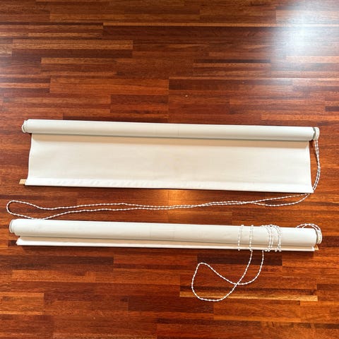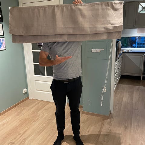 Selger en blå rullgardin med hvite stjerner, vært oppe på et rom hele tiden. Målene er 96x176 cm.
