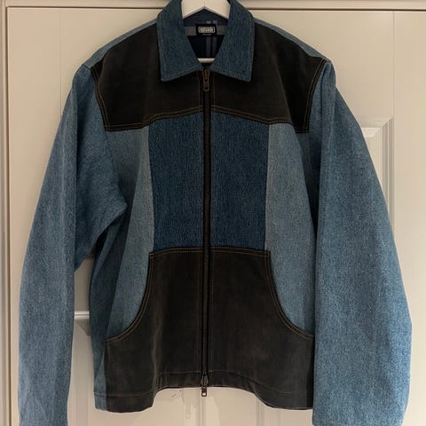 Selger en ekstremt sjelden og unik vintage jakke, laget med en vill kombinasjon av denim og mørkt bomullsstoff i ekte 90-talls patchwork-stil. Dette er en ekte statement piece for deg som samler på retro klær eller ønsker en skikkelig standout look.
