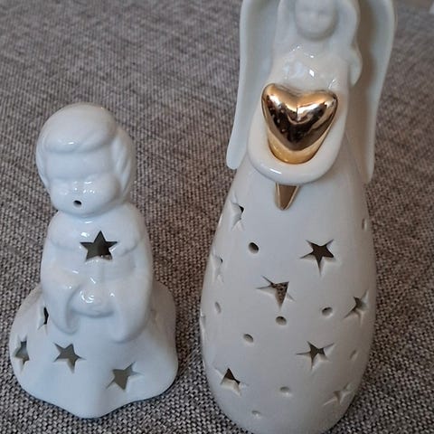 Fint brukte pyntegjenstander, vase kahler lyslykter og skilt lite hakk i den ene grå vasen.