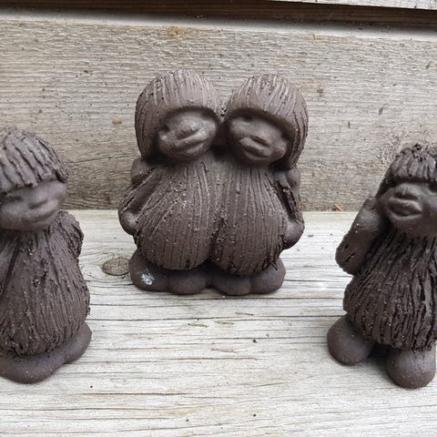 Søte troll fra Ramsing, Danmark. På bildene ser det ut som om det er en uttalt fargeforskjell, dette er kun lyset, i virkeligheten er de omtrent samme farge. Fra ca 1960-tallet. De er i fin stand.