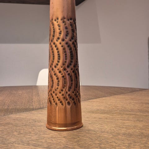 Vintage vase, laget i Norge, skandinavisk folkekunst. Høyde 22 cm, diameter på toppen 6,5 cm, diameter nederst 8 cm. Mest sannsynlig fra 1960-tallet. Trenger en kjærlig hånd, men da vil den også skinne som ny.