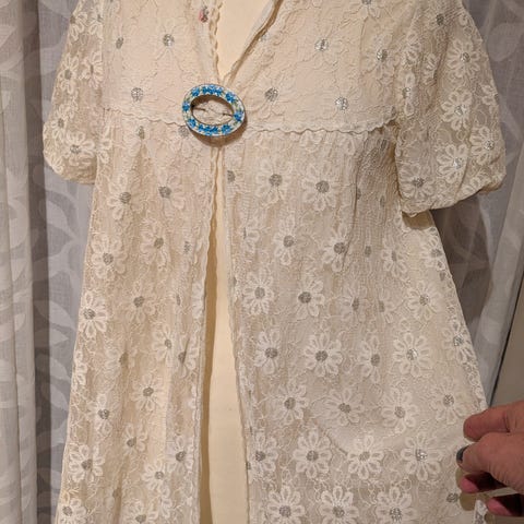 Overvidden 108 cm, lengde 65 cm. Trur det er bomull material. Maskin strikket.