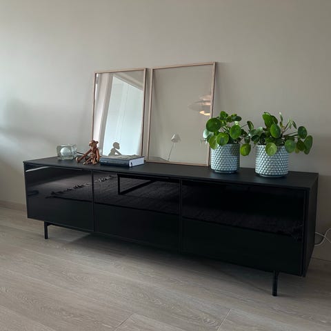 TV-benken har tre dører som skjuler romslige oppbevaringsmuligheter til alt fra elektronikk og spillutstyr til bøker og pynt. Den passer perfekt til både veggmontering og gulvstående bruk (ben følger ikke med).