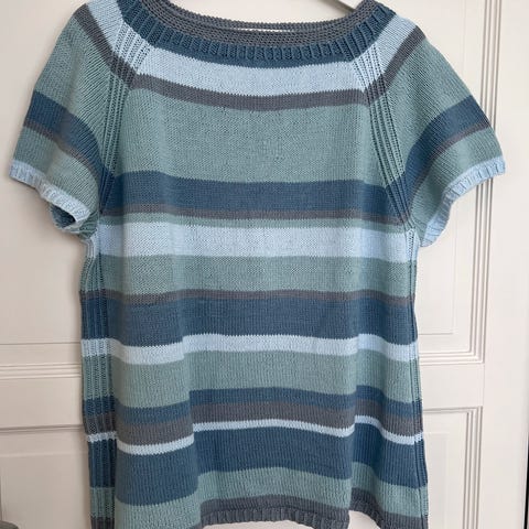Fin og sommerlig genser strikket i Petunia-garn fra Rauma. Fargen er en slags mint-sjøgrønn og modellen er litt kortere. Passer fint til skjørt og bukser med høyt liv.