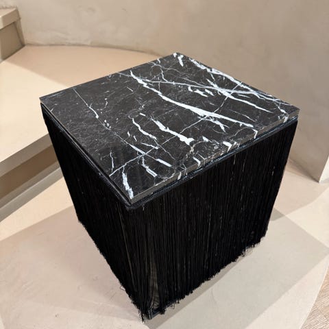 Flott bord med tung marmor plate topp med «messing» rund. Bordet kledd med fløyel og med «messing» «understell». Betalte 12000,-for dette bordet og i dag selges det minste bordet for den prisen. Bordet er uten skader. Bildene er fra da leiligheten min var i bladet Maison. Bildet av marmorplaten har jeg tatt. Bordet framstår som nytt.
