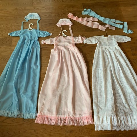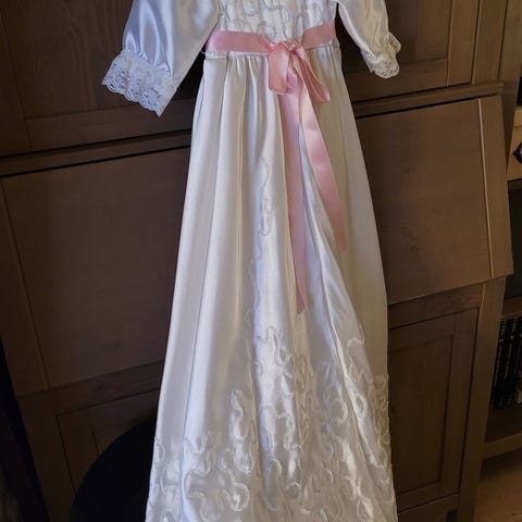 Nydelig hjemmestikket dåpskjole til leie. Sløyfer til både gutt og jente. Rens inkludert i prisen. Kan utleveres mandal/vigeland