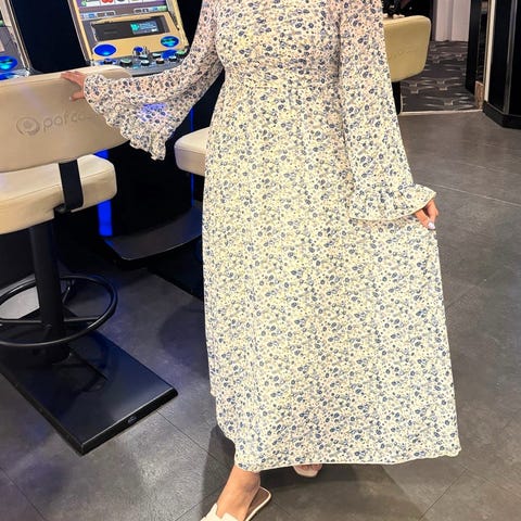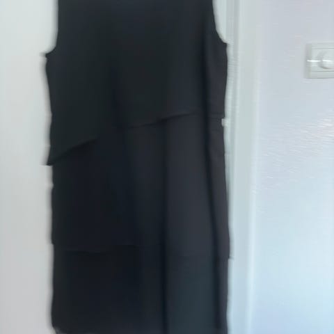 Brukt og vasket en gang. Pen og lett kjole med gjennomsiktige ermer og lett a-fasong. Tynn i stoffet og henger pent på kroppen, jeg bruker normalt str L. XXL på lappen, men det vil jeg ikke si den er.. passer L-XL alt ettersom hvor ettersittende.