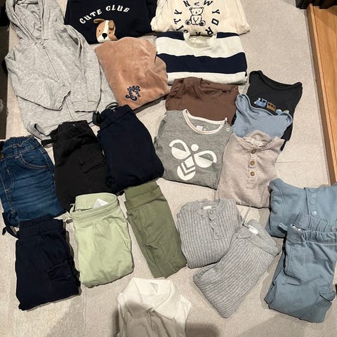Inneholder: 3 shortser (en av dem har merke Name it), 2 bodyshortser som er kortermet, 1 heldress (merke: Name it), 3 jeans, 1 fleecebukse, 2 joggebukser og 3 gensere.