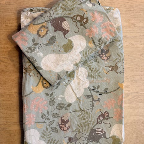 Selger pent brukt sengetøy og par gardiner (brukt bare 3 mnd) med jungel motiv og dyr fra IKEA. Sengetøy av myk blandling av bomull og viskose. Dynetrekk- 150x200 (med glidelås) , putetrekk - 50x60.